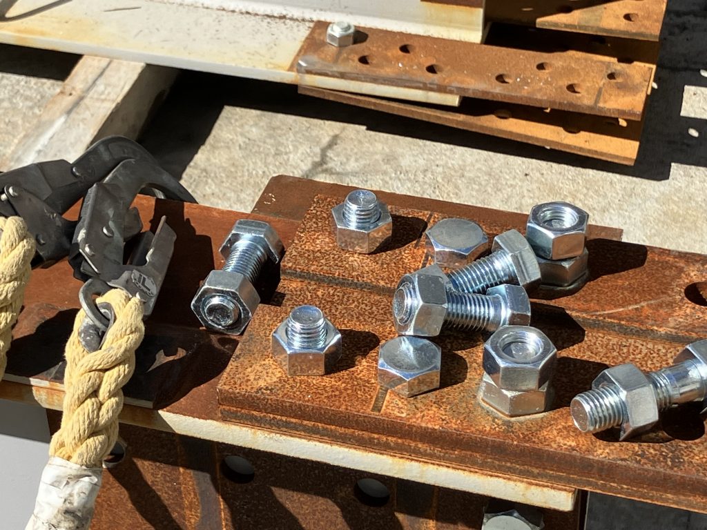 玉掛を待つ鉄骨の上に並べられているボルトは”仮ボルト”と呼ばれるものです。