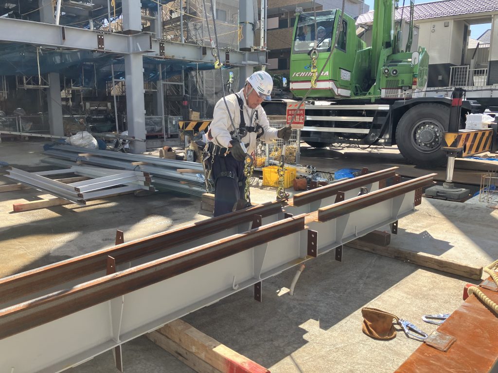 梁の1つ1つは、1本600㎏を超えるような重い鉄骨ですが