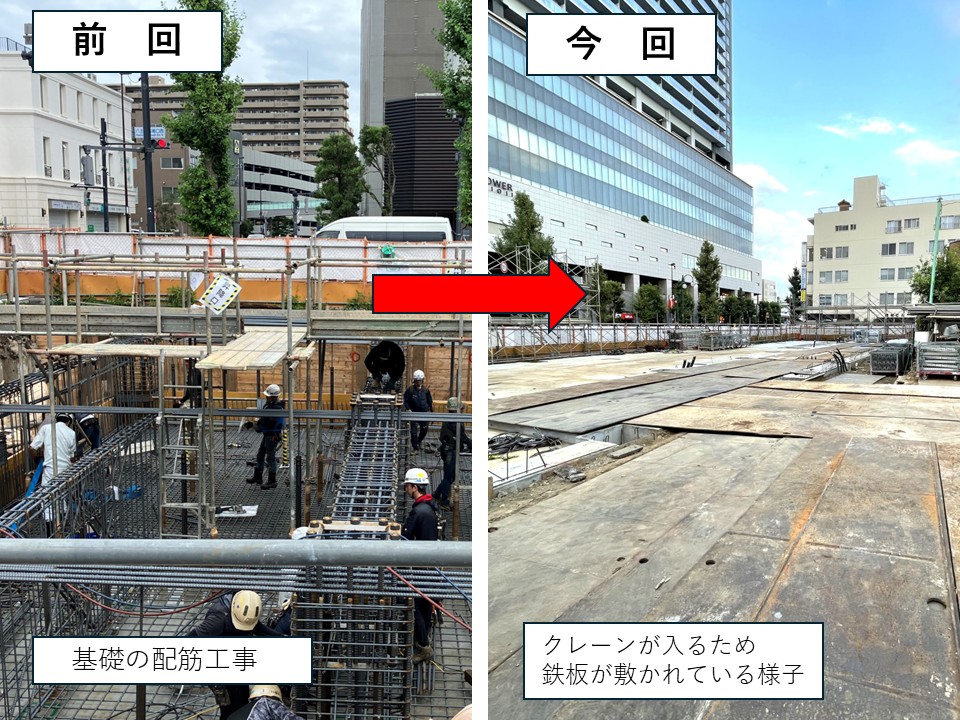 建て方で使用するクレーンの乗り入れに備え、辺り一面に鉄板が敷き詰められていました。