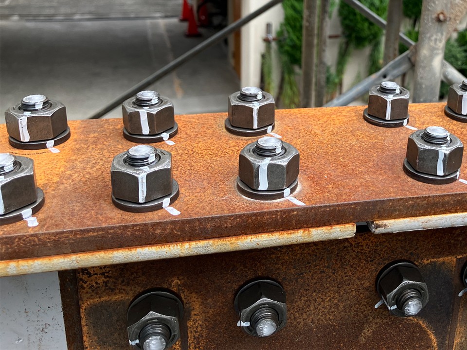 高力ボルト接合は、”建て方”を行った後に、歪みや傾きを確認し