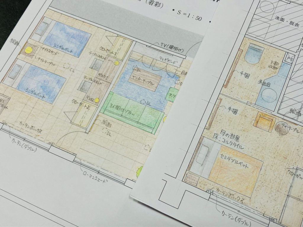 家具・建具・動線の計画を立て、平面図や立断面図、アイソメなどを作成する作業です。