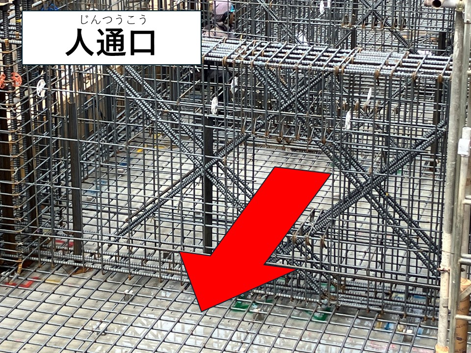 矢印部分が開口(人通口)となり、その周りに斜めに設置されている鉄筋を補強筋と呼ぶ。